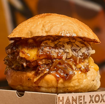 Doble de carne (90g cada una), pulled pork, honey mustard, queso provolone y cebolla crunchy